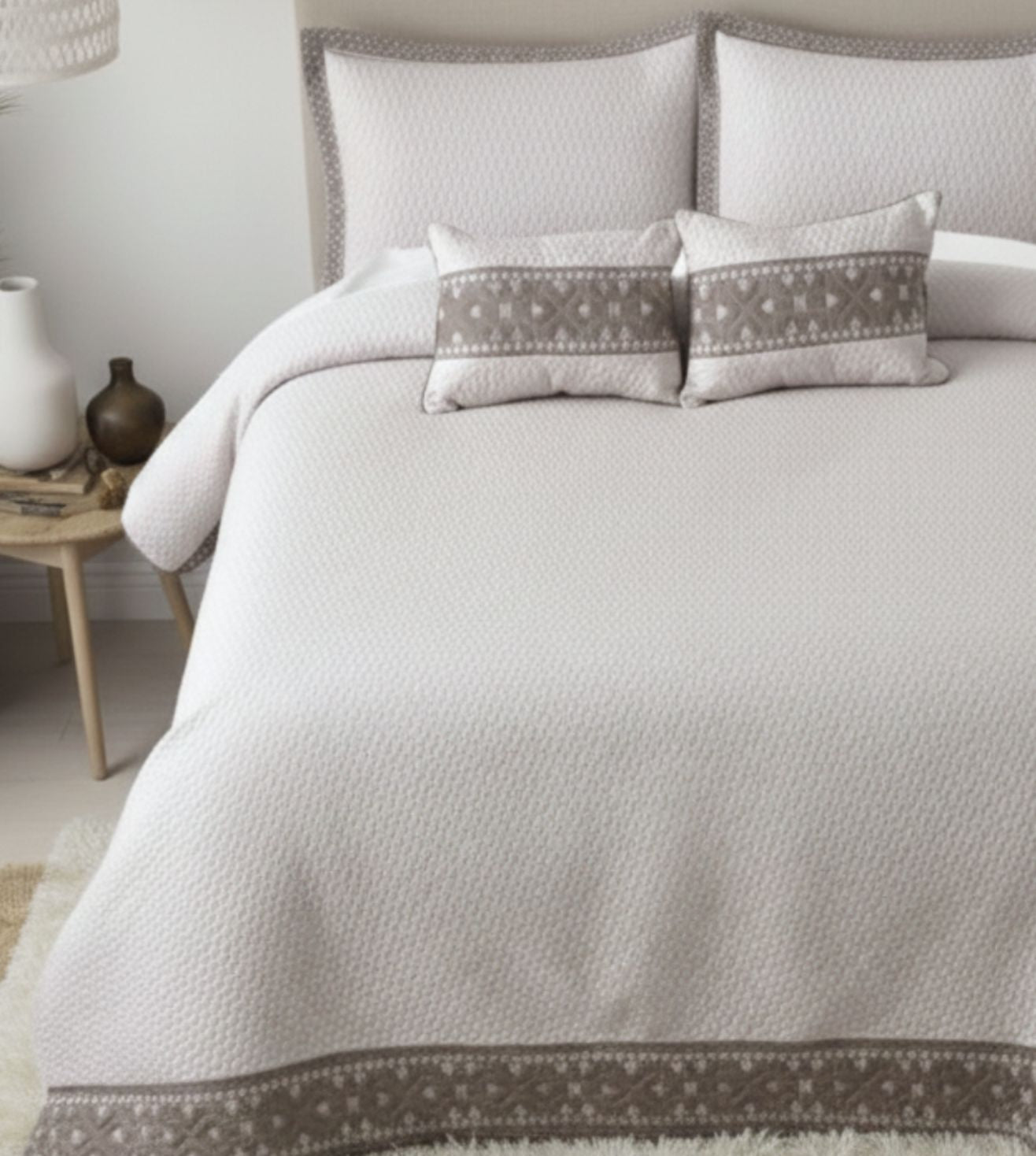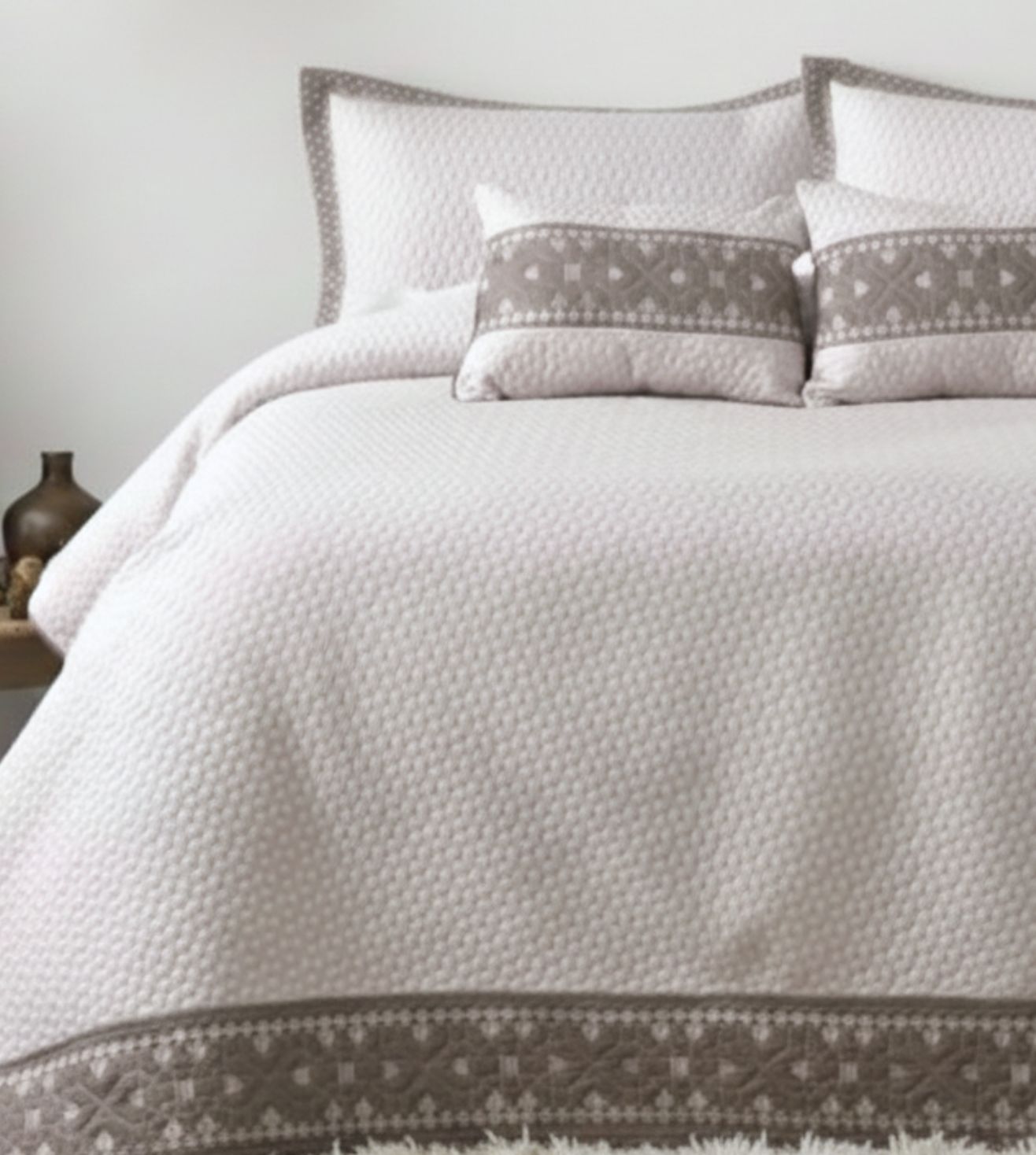 • Detailing: Intricate quilting and embroidery on the bedcover and pillow covers.